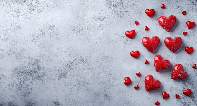Decorative red hearts on gray wooden table. Valentines day greeting card. Web banner. Top view. Copy space