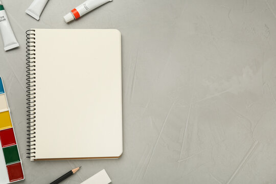 Flat lay composition with blank sketchbook on light grey stone table. Space for text