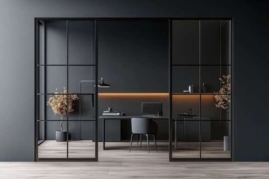 Modern office with glass doors. This image is perfect for showcasing business, workspace, or office design concepts.