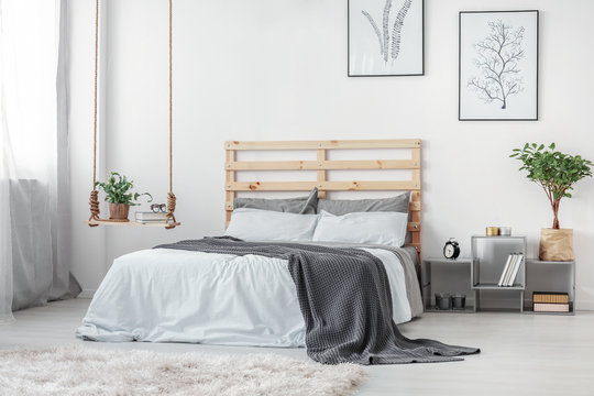 Stylish swing with books and plant in pot next to king size bed with wooden headboard and grey and white bedding