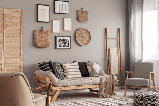 Trendy vintage armchair next to chic scandinavian sofa with pillows in classy living room interior