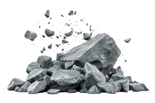Crumbling grey rocks falling isolated dramatic scene 3d pile ruin hard on transparent background