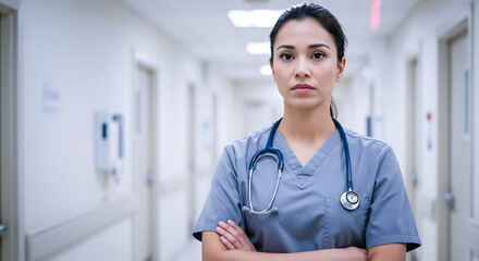 A female nurse in grey scrubs with a stethoscope stands in a hospital hallway with arms crossed, looking at the camera