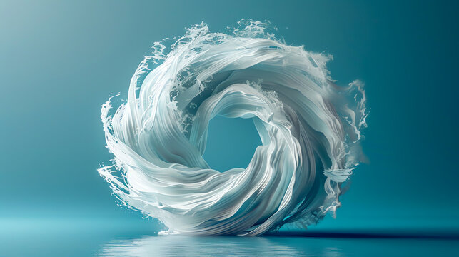 Tilted angle view of a minimalist hurricane, swirling white and grey shapes on a serene blue background, digital 3D rendering, clean lines and soft shadows