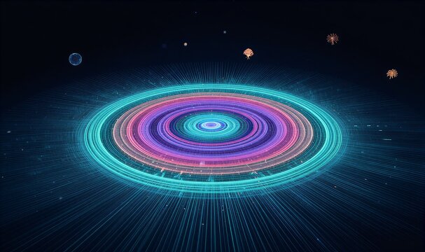 Neon spiral galaxy with glowing rings, cosmic grid pattern in deep space.