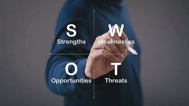SWOT analysis diagram with hand drawing axes: Strengths, Weaknesses, Opportunities, Threats