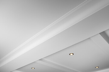 Suspended and grid ceiling with LED spots lamps and drywall construction in empty room in house interior. Stretch ceiling white and complex shape.