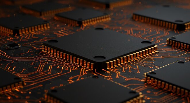 Futuristic electronic circuit board with glowing neon lines and microchips, illustrating advanced technology and digital connectivity.