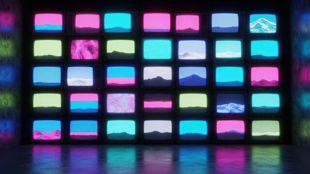 A dark room with a large grid of retro glowing screens displaying vibrant abstract and landscape scenes
