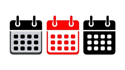 Three stylized calendar icons, one red, two black and gray, with square grid layouts