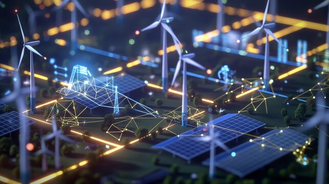 A network of renewable energy sources like wind turbines and solar panels connected to a smart grid, illustrating how the grid integrates various power sources to maintain steady electricity supply.