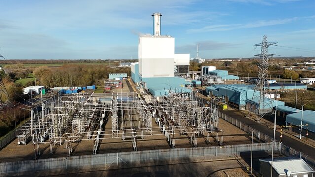 Aerial view of the stark white industrial architecture contrasting against a clear blue sky, with power lines stretching like intricate webs across the landscape, Kings Lynn, United Kingdom.