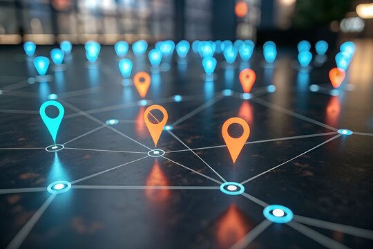 Network of Location: This striking visual showcases interconnected location markers within a digital landscape, symbolizing the modern concepts of connectivity, geolocation, and networking.