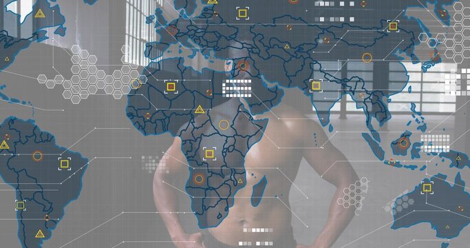 Standing adult male posing shirtless in studio with translucent world map overlay, markers, windows