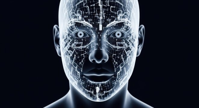 Woman interacting with virtual reality interface and hexagonal grid overlay