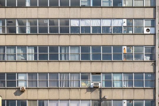 Midrise urban buildings lining city street with recessed windows and grid facade
