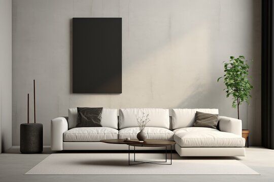 Minimalist Living Room in Monochrome Palette featuring a sleek white sofa, black coffee table, floor lamp, and abstract wall decor. Template