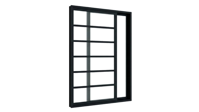 Black framed window with paneled glass and a white trim isolated on a white background in a simple design