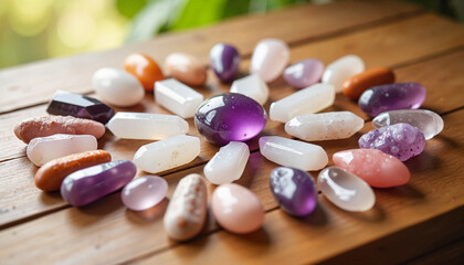 Symmetrical healing crystal grid on wooden table with clear quartz, amethyst, and rose quartz in flower pattern