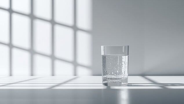A clear glass of water on a structured grid surface with side illumination serving as a background for text or UI layout, World Water Day