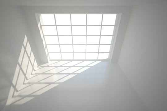 Sunlight pouring through grid windows illuminating wooden table and metal chair in loft