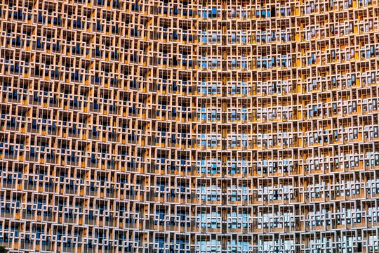 A grid of windows of a skyscraper building in the form of an abstract pattern with an interesting design.
