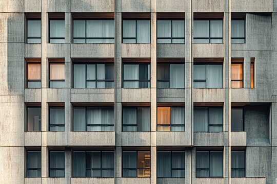 concrete residential building facade with repetitive grid of windows and recessed balconies, a few warm lit windows creating a quiet, solitary dusk mood