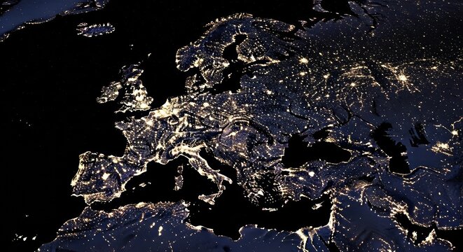 Global map illuminated with glowing orange and yellow lights highlighting population density and urban areas at night with visible continents and ocean outlines in dark background