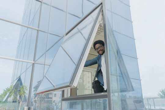 Woman presenting at office celebration holding smartphone with congratulations banner and teal grid