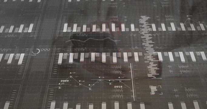 Displaying digital dashboard on office glass, showing charts and faint reflection in dark blazer