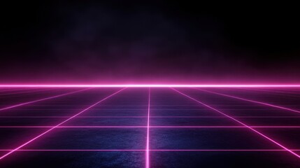 Neon retro grid horizon evoking 1980s synthwave futurism with magenta glow and reflection