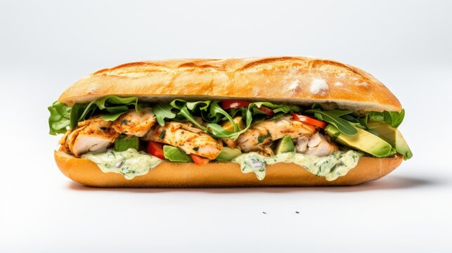 olive ciabatta bread sandwich made of grilled chicken, avocado, coriander, spinach, creamy sriracha mayonnaise