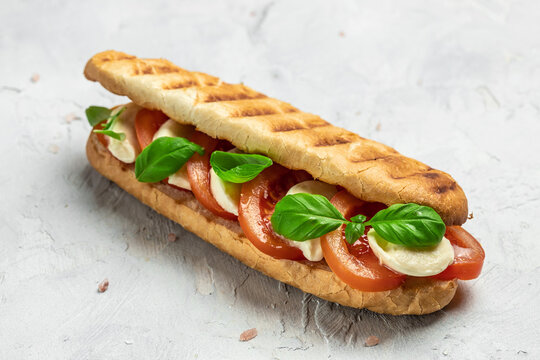 Pressed and toasted panini caprese with tomato, mozzarella and basil, Caprese Panini Sandwich. Delicious breakfast or snack, Clean eating, dieting, vegan food concept. top view
