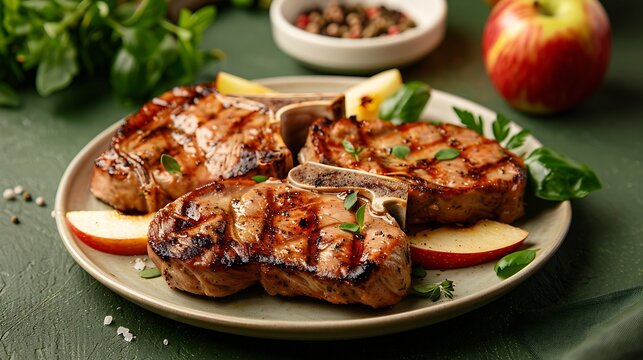 Thick, juicy grilled pork chops with deep char lines, floating with a drizzle of apple cider glaze, surrounded by caramelized onions and fresh thyme sprigs.