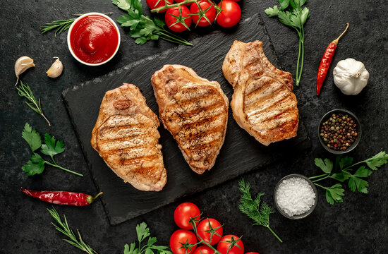 Grilled pork steaks with spices on wooden cutting board in the kitchen