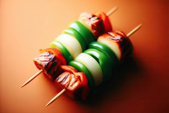 Close-up of grilled vegetable skewers with red bell peppers, green peppers, and onions on a wooden skewer. Set against an orange background.