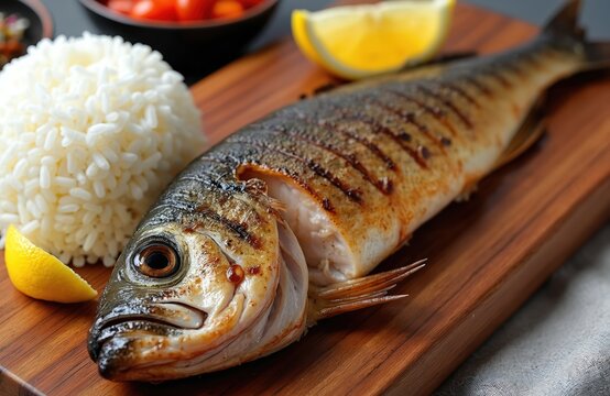 Grilled Salmon Filet With Rice And Lemon Wedge Images