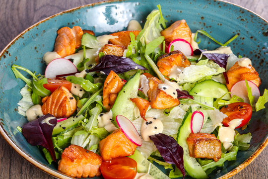 Healthy salmon meal with mashed potatoes and fresh salad on white plate