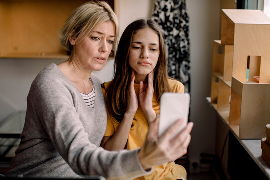 Mother sitting with daughter explaining neck pain to doctor through mobile phone at home