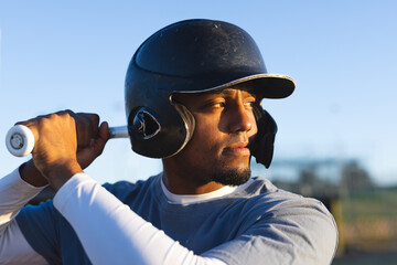 African American male baseball player gripping metal bat and wearing black helmet at batting area