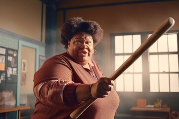 This dramatic image captures an elderly woman, filled with anger, tightly gripping a baseball bat while sitting in a car, reflecting intense emotions of frustration and unexpected power.