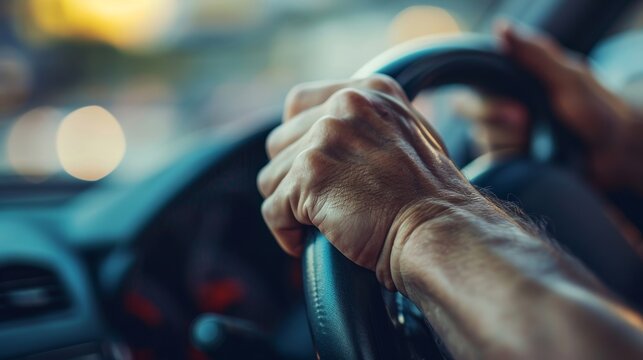 Hands on the Wheel: Capturing the essence of driving, a close-up shot focuses on hands firmly gripping the steering wheel. The road ahead beckons under a sun-kissed sky.