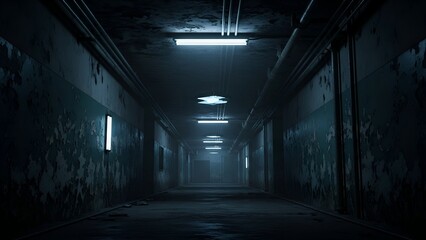 Mysterious urban tunnel with graffiti and fluorescent lighting