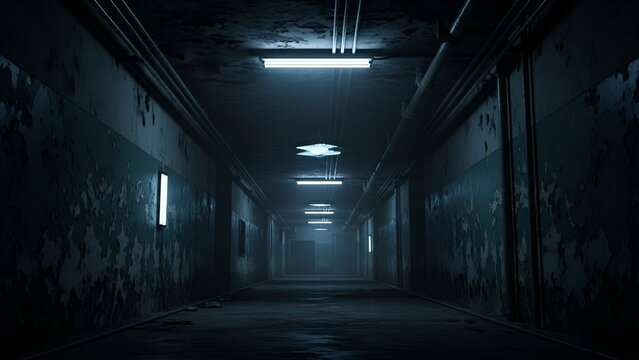 Symmetrical view of long industrial corridor lined with pipes and fluorescent lights. Concrete walls and floor in underground tunnel. Atmospheric architecture for factory or facility infrastructure