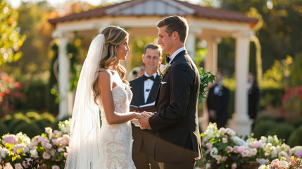 Bride and groom enjoying sunny outdoor wedding ceremony