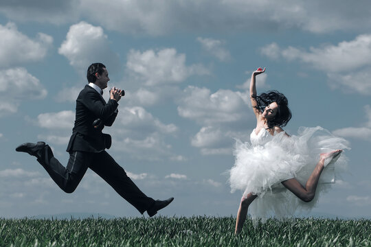 Silhouette of a wedding couple enjoying romantic moments at sunset. Bride and groom in field with sunlight. Newlyweds in nature location. Man and woman walking on meadow on top of mountain. Back view.