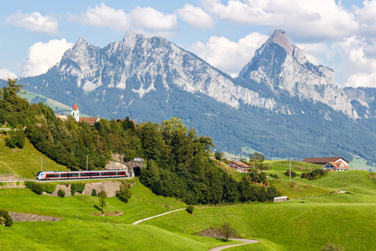 Passenger train type Stadler Flirt of Südostbahn at Grosser Mythen mountain in the Swiss Alps in Arth, Switzerland