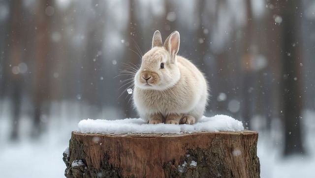 Fluffy beige rabbit perching on snow-topped stump in frosty forest with falling snowflakes