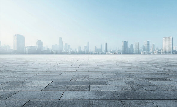Glass office tower reflecting warm sunrise over urban skyline with perspective grid overlay