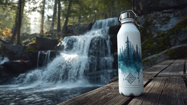 White reusable water bottle stands among lush green ferns on mossy ground in peaceful outdoor location